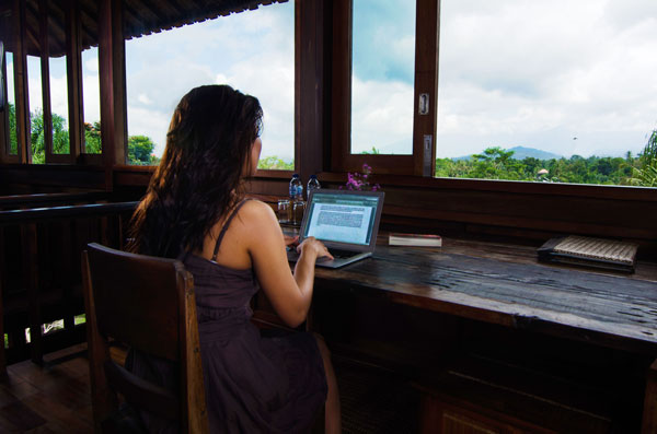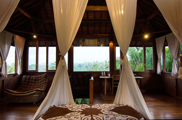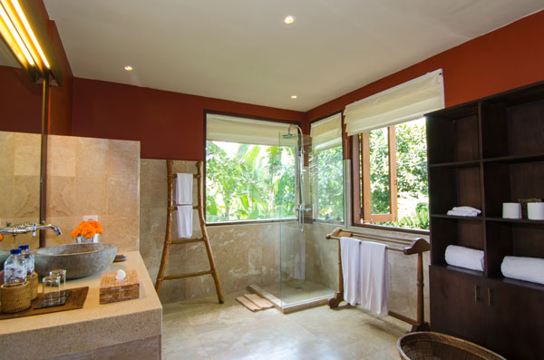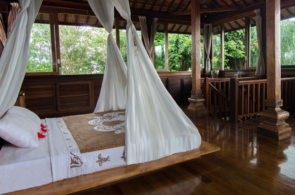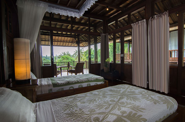 Villa Atas comfortably sleeps six in queen size beds in three bedrooms. The guest bedrooms all have large bath tubs and showers. This villa has a one of kind infinity bath tub in rear of the house on the second floor with magnificent views of a river gorge as well as rice paddies in the distance. The second floor suites in both houses have sliding glass panels that open to beautiful vistas of mountains and rice paddies.