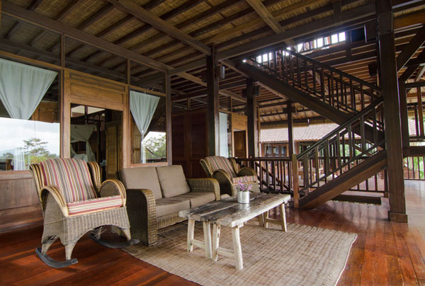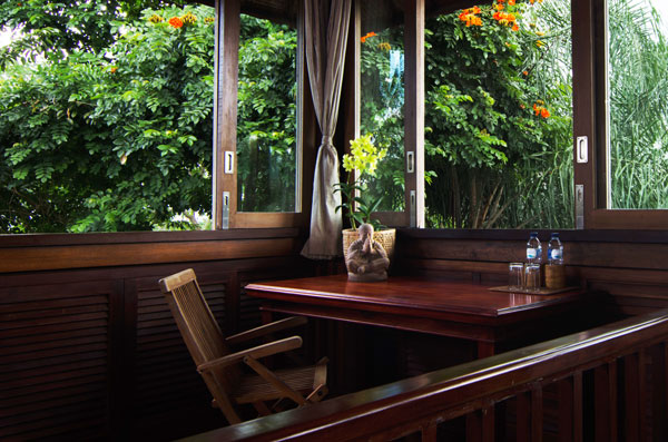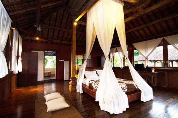 Villa Atas Awan’s design comprises two magnificent century old wooden houses reconstructed in a quiet rural setting. The houses, which have been updated with modern baths and electrical appliances, are anchored by solid pillars of ironwood and finished in teak and other tropical woods. Separated by a stunning 30 meter swimming pool, with expansive gardens, and open sitting areas on the first and second floors, the house provide wonderful spaces for outdoor living. One enters Villa Atas Awan through the outer courtyard and climbing the stairs through double Balinese doors, a path leads left to Villa Atas and right to Villa Awan.